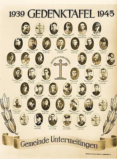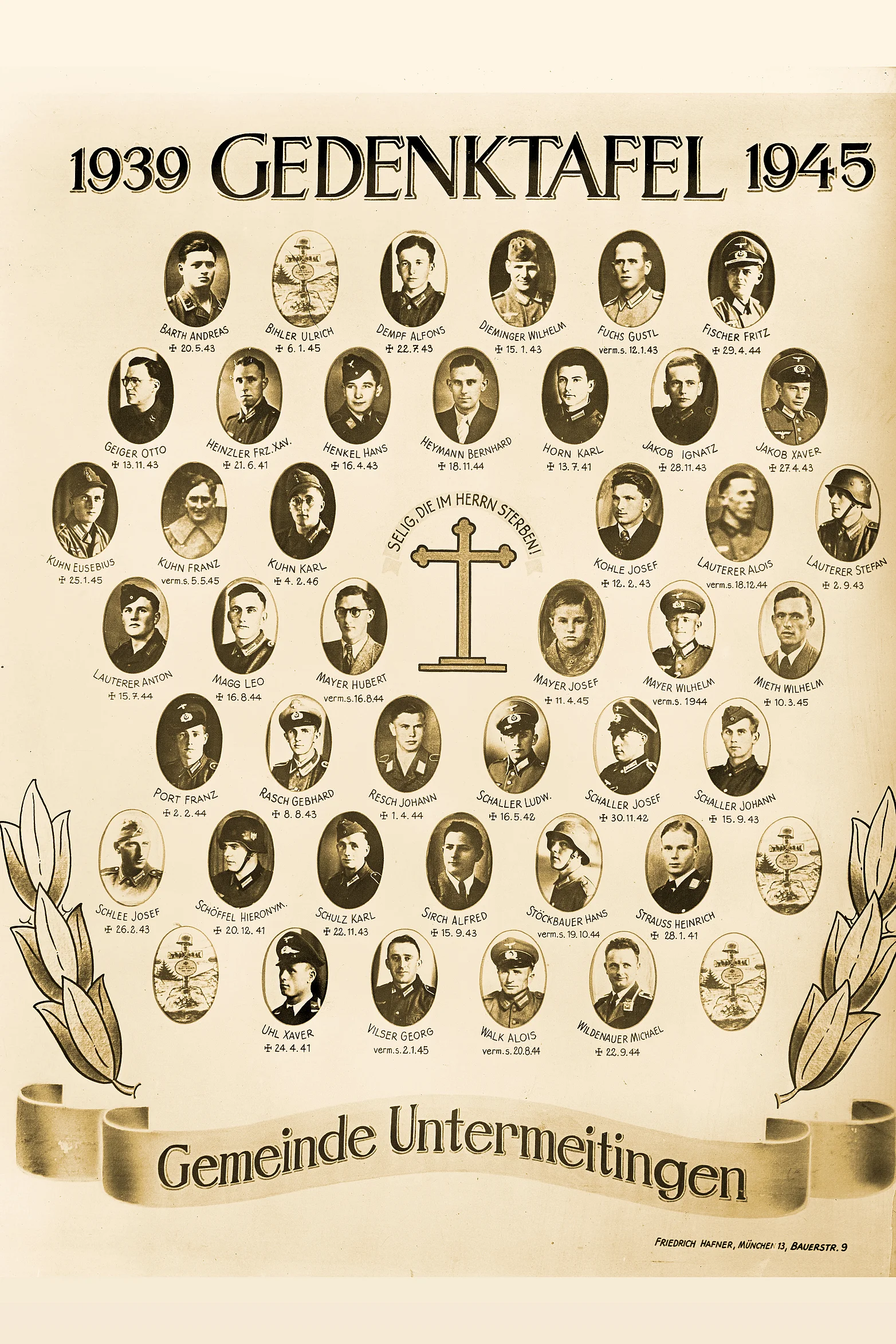 Als der Zweite Weltkrieg begann, wurden die meisten Männer zum Kriegsdienst eingezogen, um für Deutschland zu kämpfen. Viele überlebten den Krieg nicht oder wurden verwundet. Die Menschen hatten jahrelang mit den Erinnerungen an diese grausame Zeit zu kämpfen. An die Gefallenen, so nennt man im Krieg umgekommene Soldaten, erinnern in vielen Gemeinden Gedenktafeln, wie hier in Untermeitingen. Sie erinnern uns an die Grausamkeiten des Krieges. Nicht umsonst ist seit Ende des Zweiten Weltkriegs ein Leitspruch in Deutschland: „Nie wieder Krieg!“